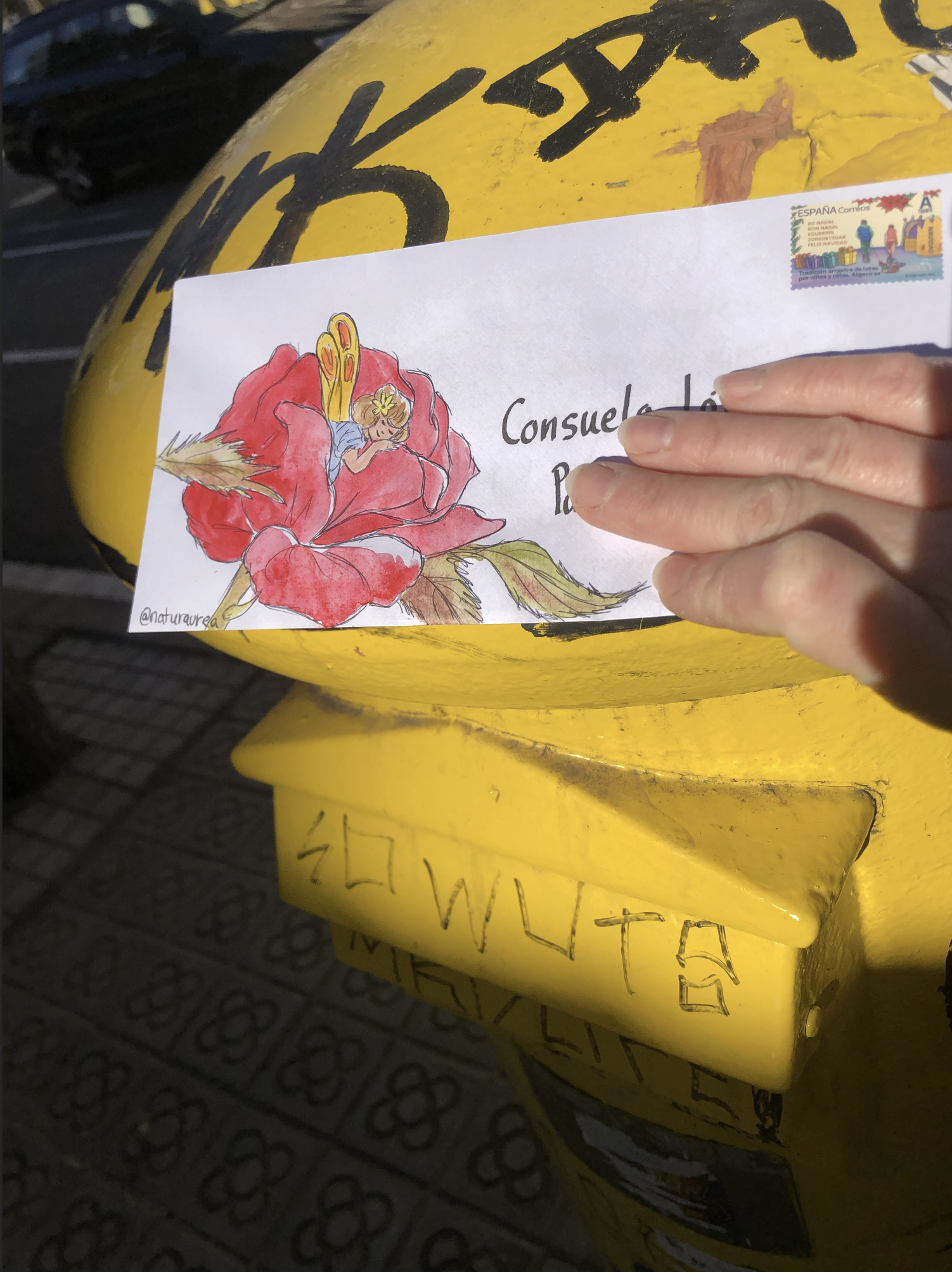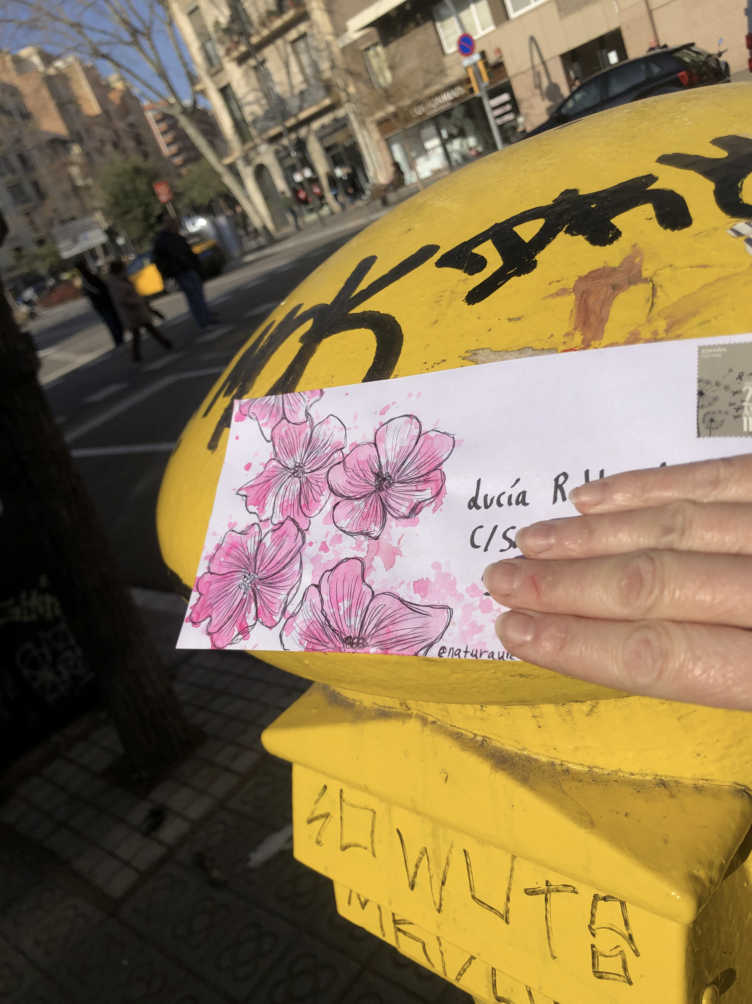 En mi caso tardo más o menos media hora en escribir y una hora en decorar el sobre. Decoro los sobres porque lo he hecho siempre y porque me sirve de excusa para explorar otros aspectos pictóricos diferentes a mi trabajo que me ayudan a crecer como artista y a pensar en el destinatario y en las carteras o carteros que se encuentren con algo de color en el correo postal.