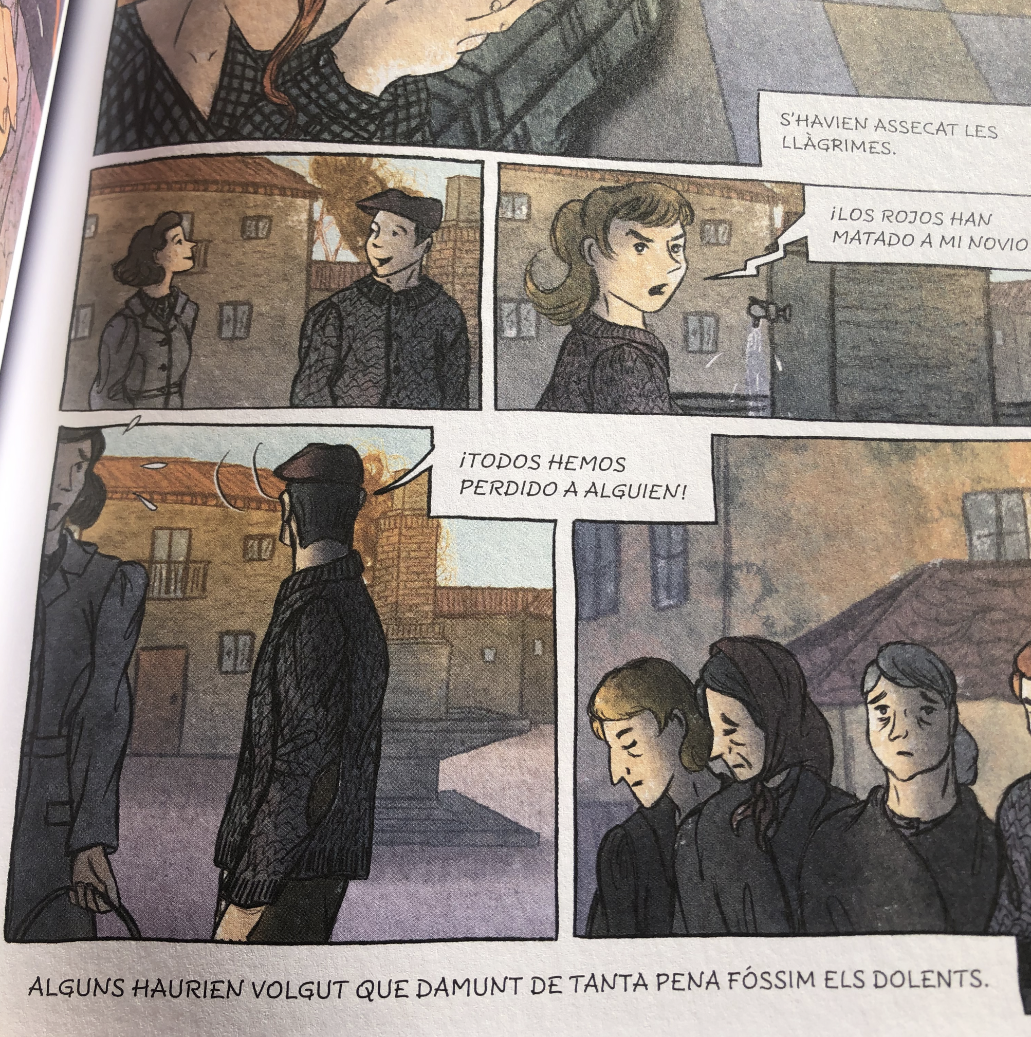 Me he acorado del diálogo que creé para esta escena de la página 87 de nuestro cómic en el que tras la frase de la novela “Los rojos han matado a mi novio” un chico del pueblo donde son deportados las familias de los cabezas de familia fusilados por el ejército nacional, defiende a Elvira.